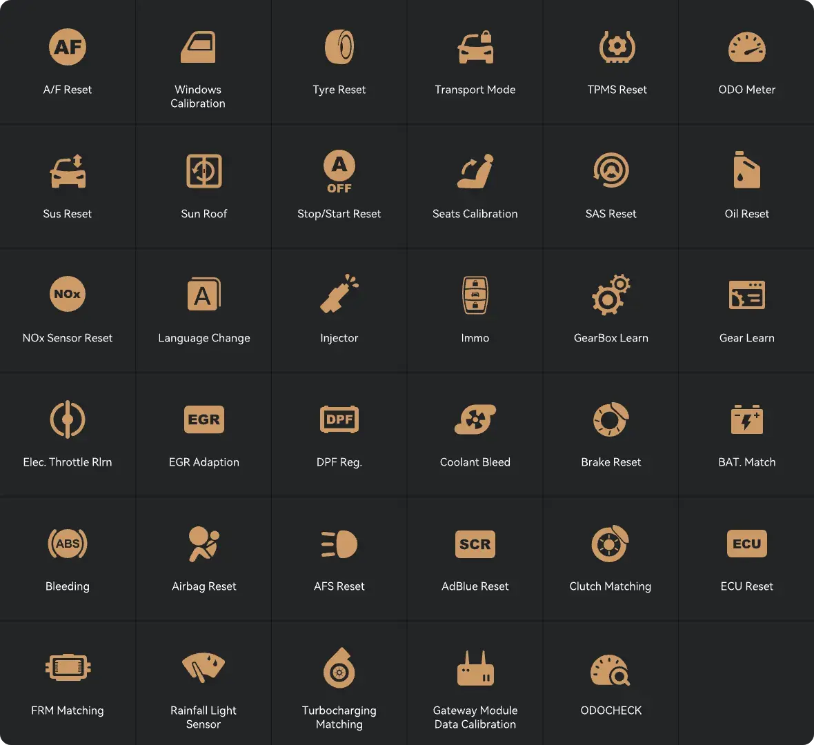 OE-Level Functions – ECU coding, 34 active bi‑directional tests, and 35+ maintenance resets including ABS bleed, DPF regen, throttle relearn.